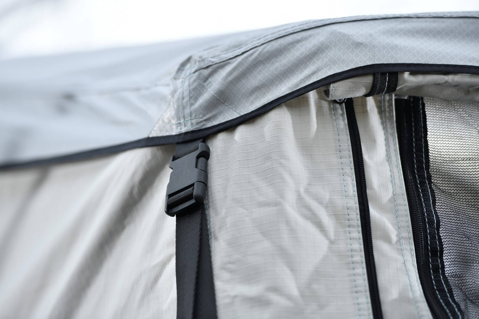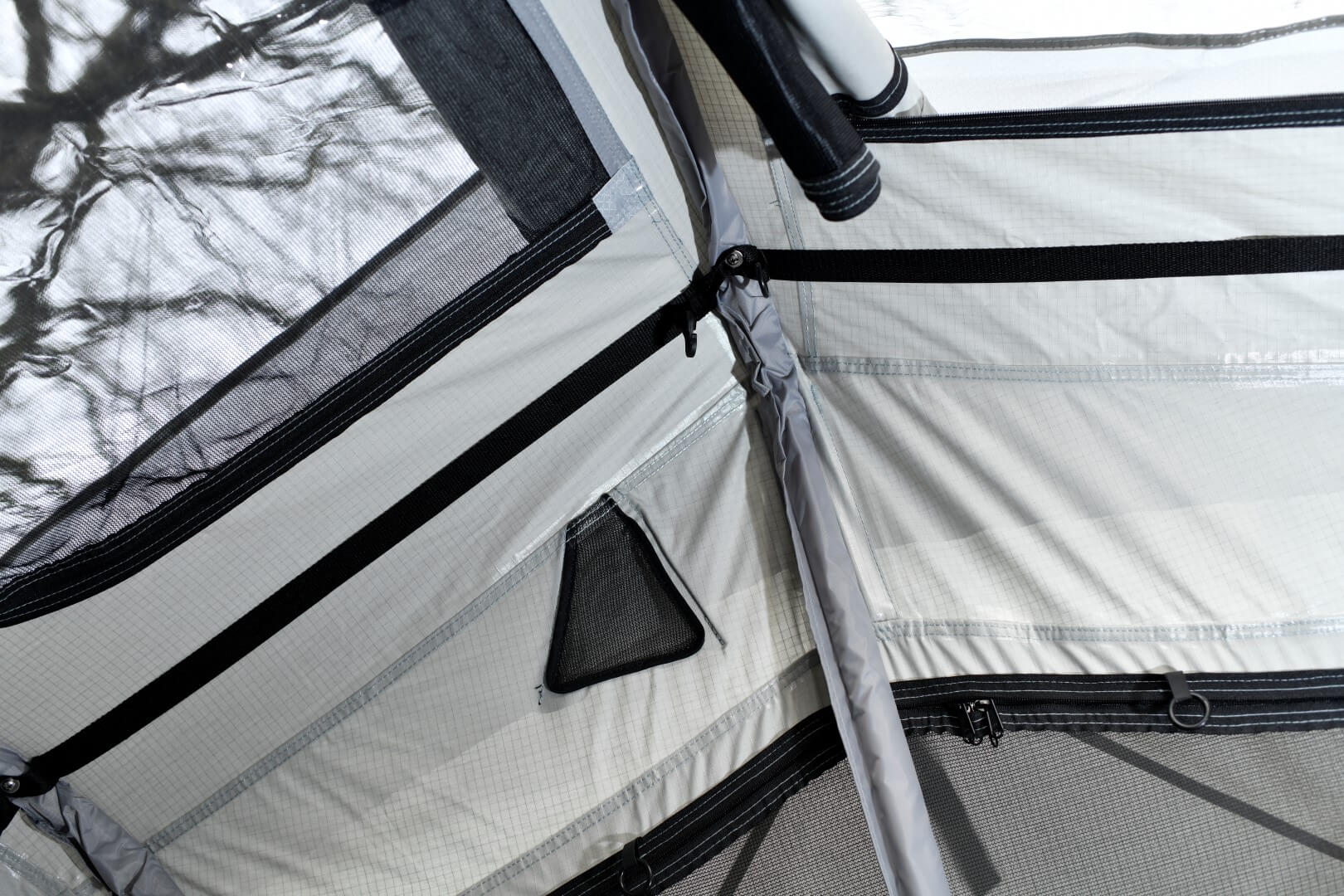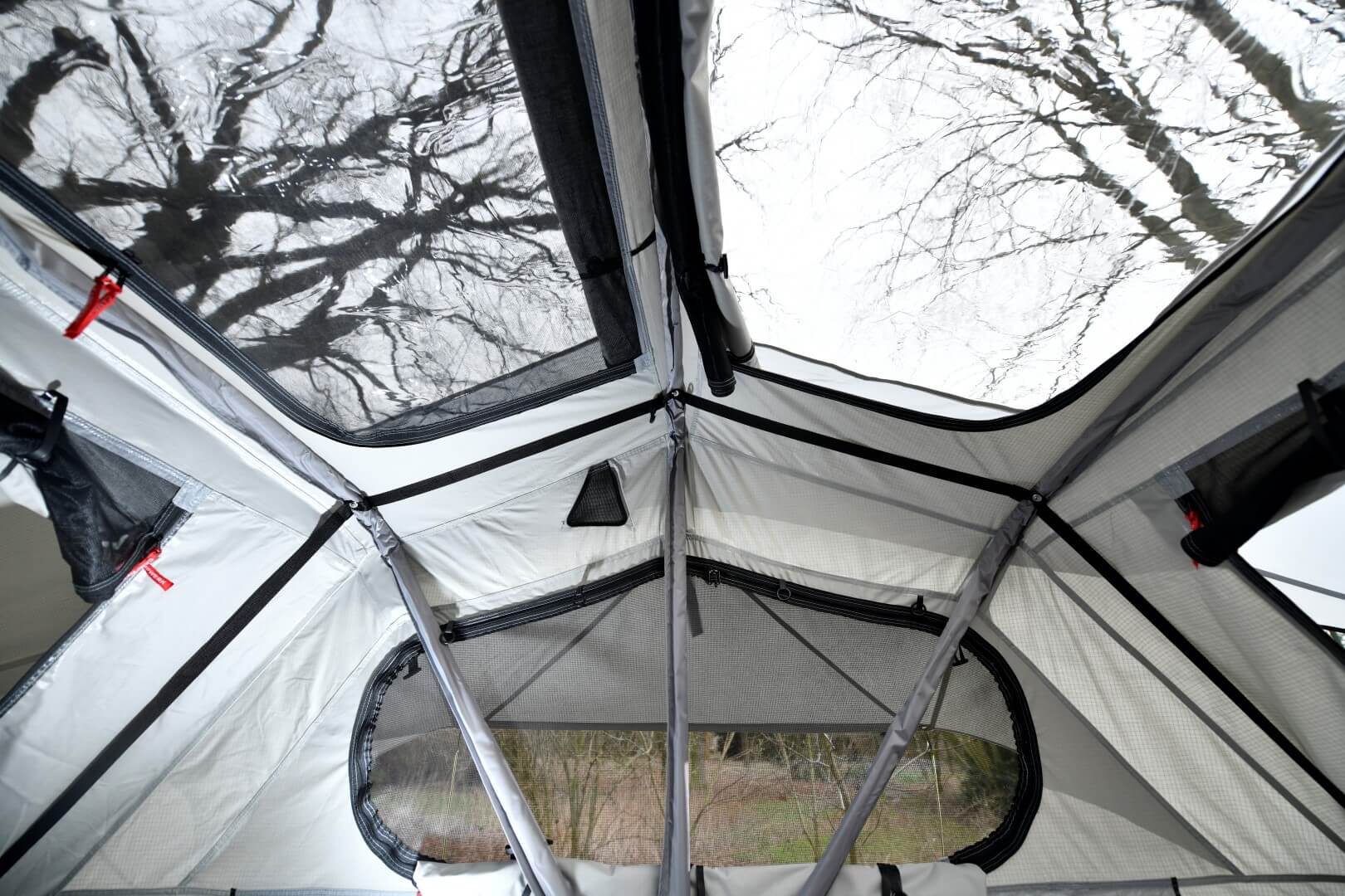 Para poder disfrutar plenamente de la vista desde las alturas, la tienda de techo Adventure está equipada con grandes ventanas en todos los lados. Cada ventana está provista de una mosquitera de malla fina y robusta que mantiene alejados a los insectos molestos, así como de una protección contra la intemperie que se puede cerrar desde el interior y que le protege de manera fiable contra el viento y la lluvia. Cubiertas especiales garantizan que se mantenga una ventilación óptima en la tienda incluso en caso de lluvia intensa.