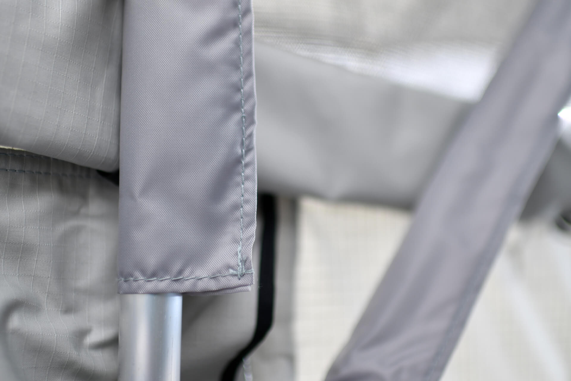 El tejido de la tienda está compuesto por una mezcla de alta calidad con un peso de 300 g, también conocida como lona o canvas. Esta combinación de algodón y poliéster une las ventajas de las fibras naturales con las propiedades de los materiales de alta tecnología modernos. El resultado es un tejido robusto y transpirable que no solo ofrece una agradable sensación al tacto, sino también una alta estabilidad de forma.Este tejido de tienda, que también se utiliza en el ámbito militar, está impregnado y es particularmente resistente al desgarro. Todas las costuras están fabricadas con un hilo especial que se expande al entrar en contacto con el agua, sellando de manera fiable cualquier orificio en las costuras.