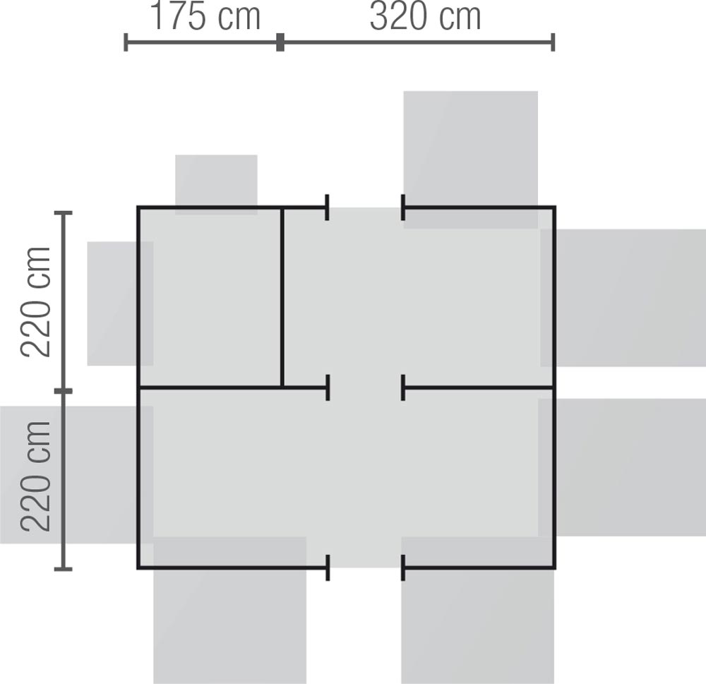 El remolque de tienda de campaña Family / caravana plegable está diseñado con 11m² (tienda principal) para familias pequeñas. Puede crecer en cualquier momento, hasta 23m² (tienda principal más tienda anexa). La tienda principal se puede subdividir fácilmente, creando si se desea un espacio para una habitación infantil o de invitados.