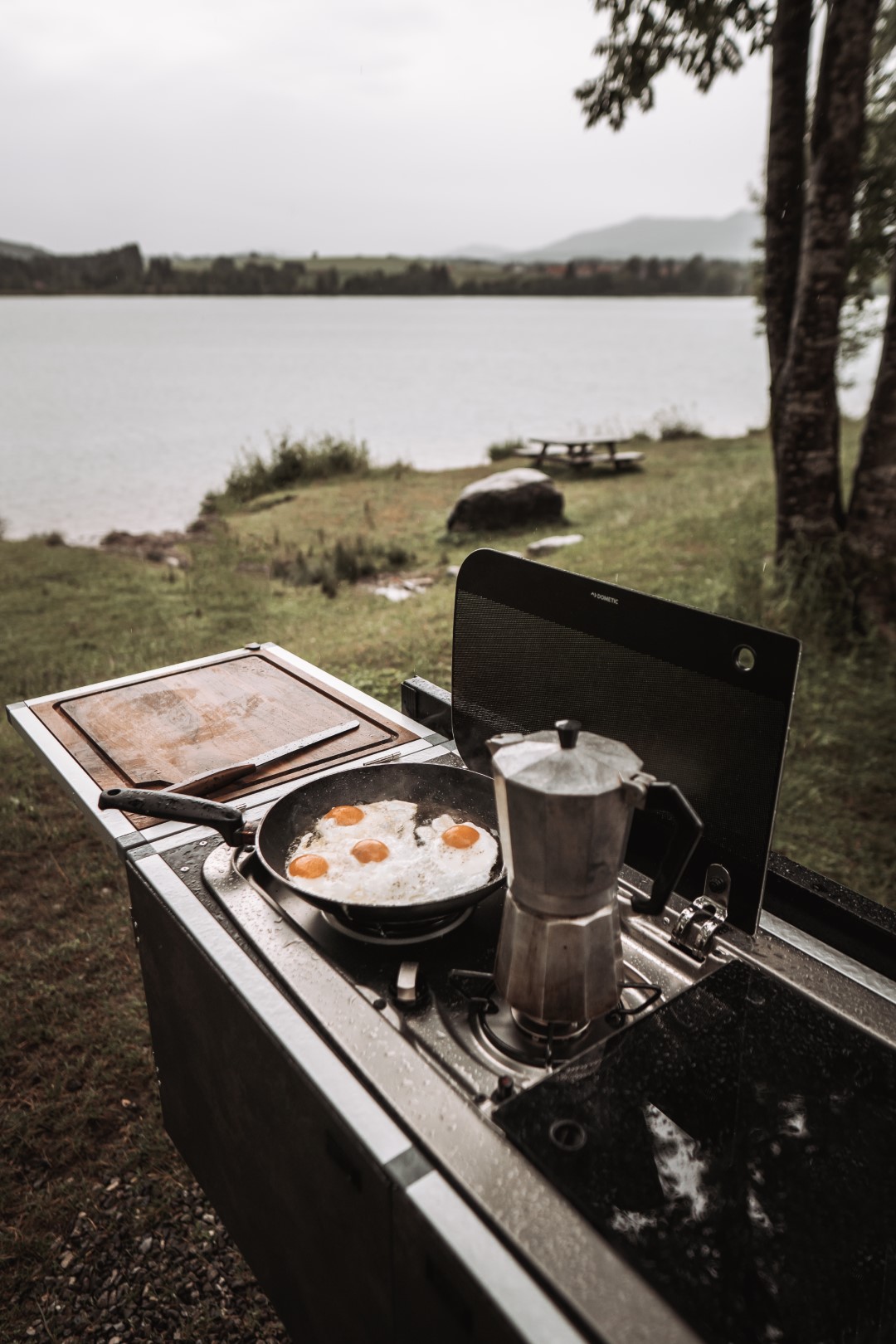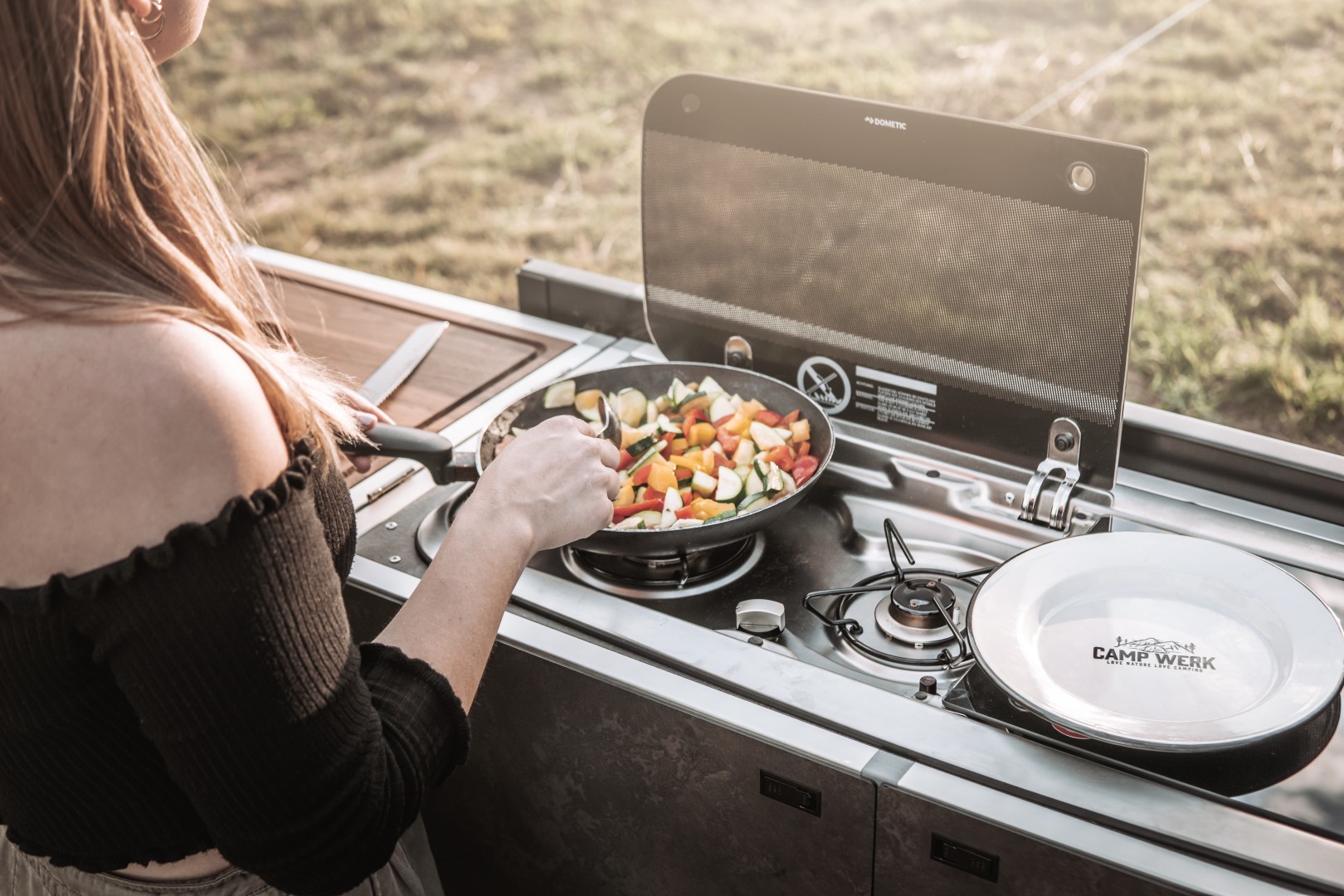 Y precisamente por eso, la cocina para remolque de CAMPWERK es a menudo el lugar donde todos se reúnen al acampar. Está integrada en el portón trasero del remolque y, por lo tanto, está lista para usar de inmediato en cuanto lleguéis. Solo hay que abrir el portón y empezar. Si prefieres más flexibilidad, puedes desengancharla fácilmente y colocarla en otro lugar. Directamente junto al lago, bajo el toldo o en medio del campamento.