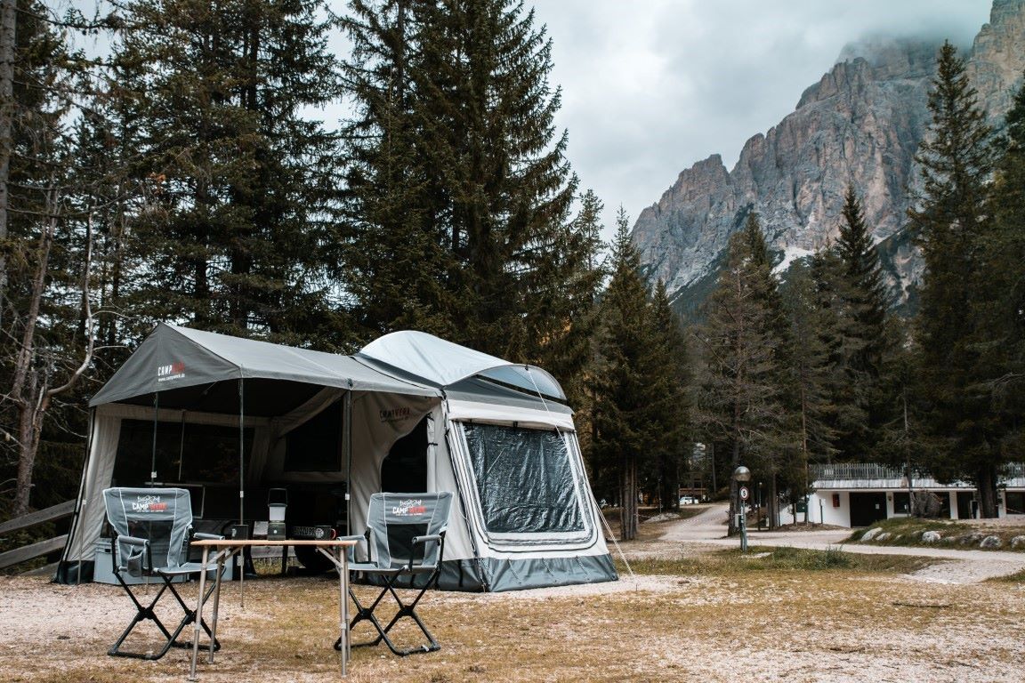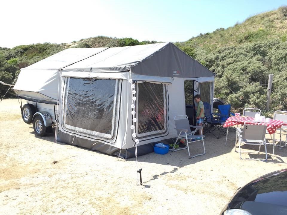 El remolque de tienda de campaña Family / caravana plegable está diseñado con 11m² (tienda principal) para familias pequeñas. Puede crecer en cualquier momento, hasta 23m² (tienda principal más tienda anexa). La tienda principal se puede subdividir fácilmente, creando si se desea un espacio para una habitación infantil o de invitados.