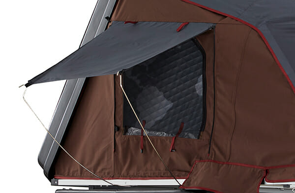 Las ventanas laterales han sido rediseñadas en el Skycamp 3.0 y equipadas con un nuevo sistema enrollable. Esto permite que las ventanas se abran y cierren desde el interior de la tienda como persianas. Por lo tanto, la configuración es ahora aún un paso más cómoda. Sin embargo, las capas de ventana exteriores todavía se pueden tensar como un techo de lluvia en ambas tiendas.