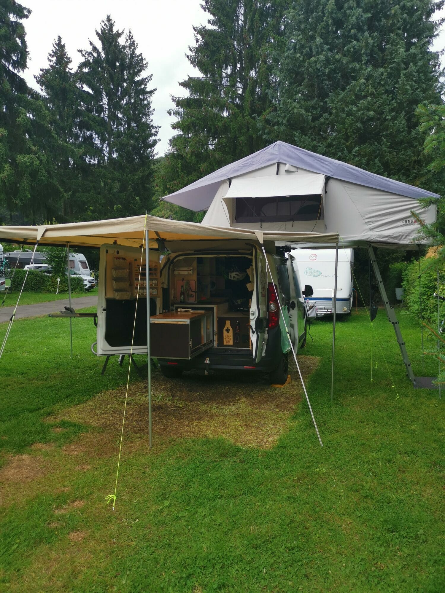 y ya la hemos montado en 3 coches diferentes (Nissan Pathfinder, Nissan X-Trail y ahora en un Fiat Doblo Maxi con extensión de cocina, inodoro, nevera portátil, sistema solar y toldo envolvente de 270 grados). Como vendimos nuestra caravana en verano, ahora intentaremos viajar con la tienda de techo el mayor tiempo posible. Como tenemos la tienda interior y el colchón autoinflable de CAMPWERK y también somos dueños del avance, esto no debería ser un problema con una estufa de petróleo para tiendas de campaña. Hay que probarlo. Pero, en general, estamos muy contentos con nuestra tienda de techo y para todos los fines de semana de 14 días es la mejor solución, rápida de montar y desmontar.