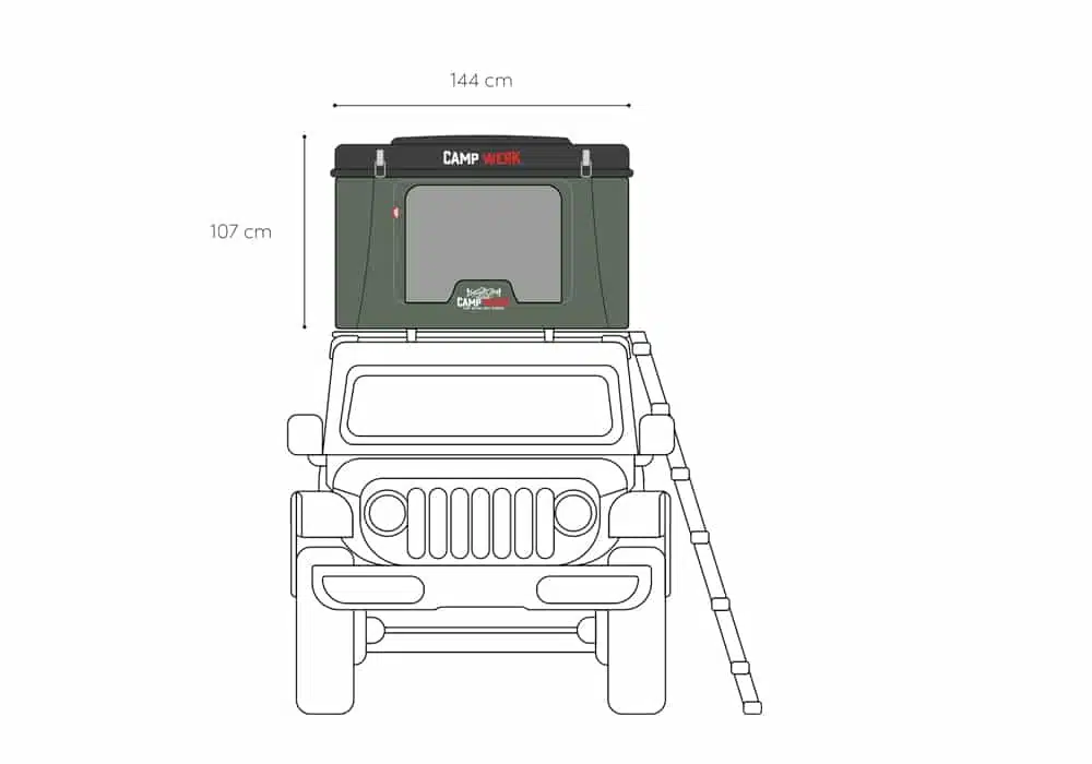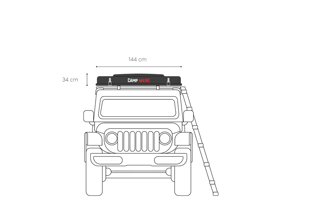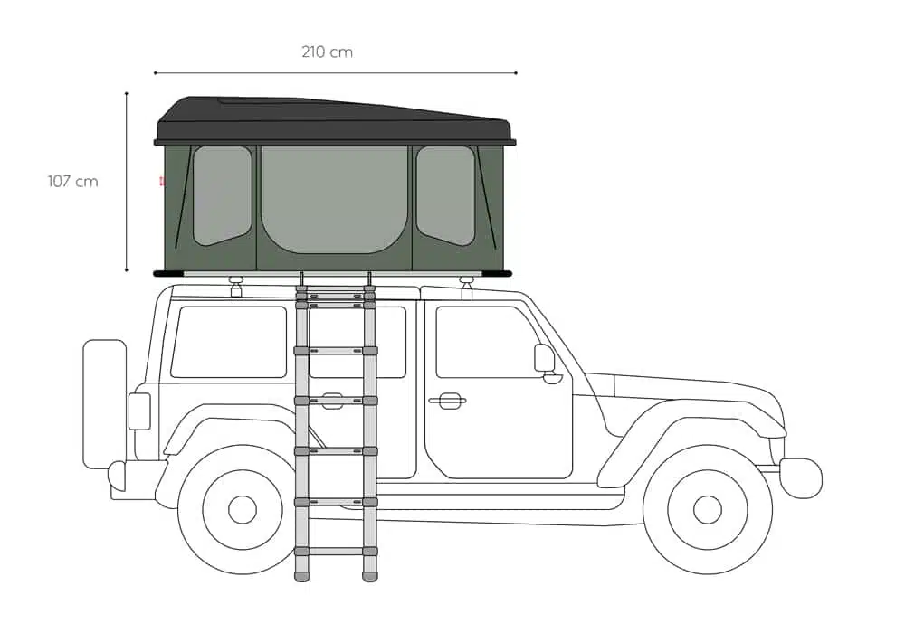 La robusta carcasa de fibra de vidrio de la tienda tiene aproximadamente 34 cm de altura. Plegada, la tienda mide 210 x 144 x 34 cm (largo x ancho x alto), lo que la convierte en una solución compacta y estable para su aventura de campamento.